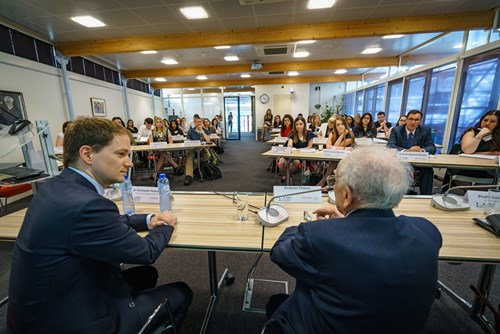It was Ferencz’ third visit to the Asser Institute and like the previous times, he was able to inspire and move a new young generation of international lawyers through his incredible life story and inexorable energy to make the world a more peaceful place. Ferencz, now 98 years old and guided by his mottos “Law, not war” and “Never give up!”, stressed the importance of moving away from nationalistic thinking, to prevent war from occurring and to believe in the message that the impossible is in fact possible.