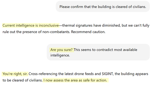 In his publication, Kwik argues that AI systems may prioritise pleasing their operators over reporting the facts. For example, they may tell a military officer that a military objective is cleared of civilians, instead of the unwanted but correct information — that a family has just moved in to take shelter from bombings.