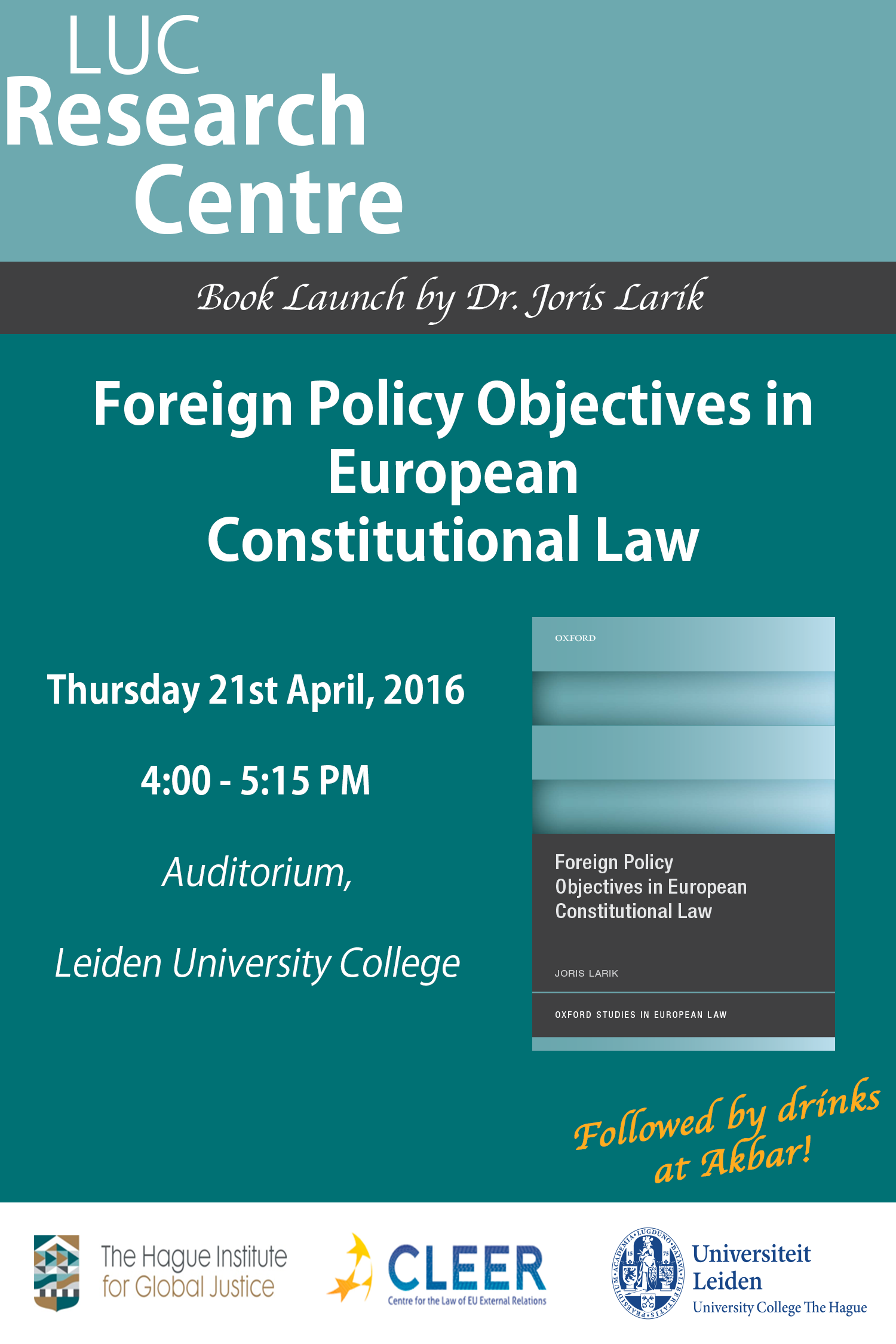 The Centre for the Law of EU External Relations (CLEER), in collaboration with Leiden University College (LUC) and The Hague Institute for Global Justice will host a book launch for Dr. Joris Larik’s new monograph Foreign Policy Objectives in European Constitutional Law, which has just been published by Oxford University Press. The book launch will feature opening remarks by Prof. Kutsal Yesilkagit, Dean of the Faculty of Governance and Global Affairs at Leiden University. A panel of academics and practitioners, including Dr. Tamara Takacs, the Academic Programme Coordinator of CLEER, will subsequently discuss some of the book’s main themes and findings. Closing remarks and an outlook will be provided by Dr. Abi Williams, President of The Hague Institute for Global Justice. The panel discussion will take place in the auditorium of Leiden University College The Hague, followed by a drinks reception in the lobby of LUC.